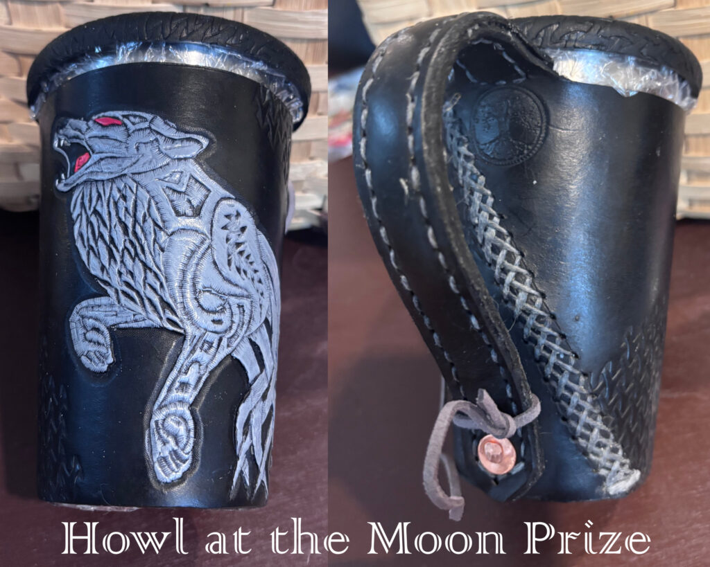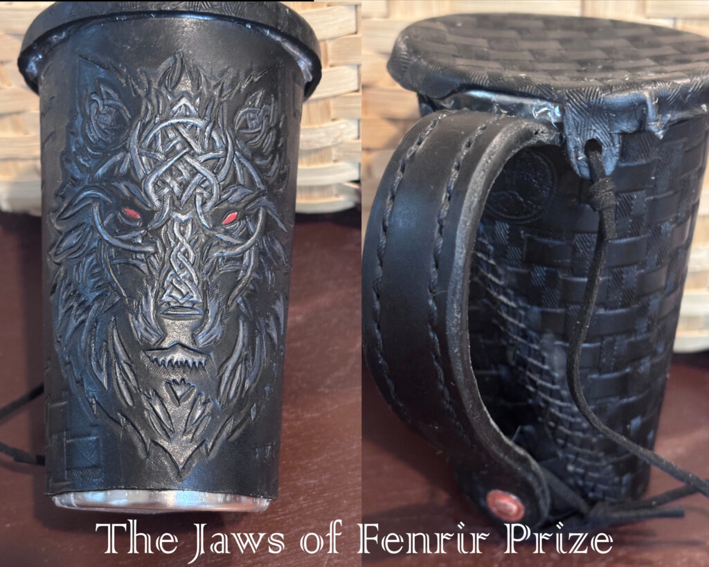 The prizes for each competition in Tyr’s Gambit are leather wrapped metal cups with a unique wolf design to fit the theme of the competition.Each prize has been handcrafted by Lord Roderick Little.